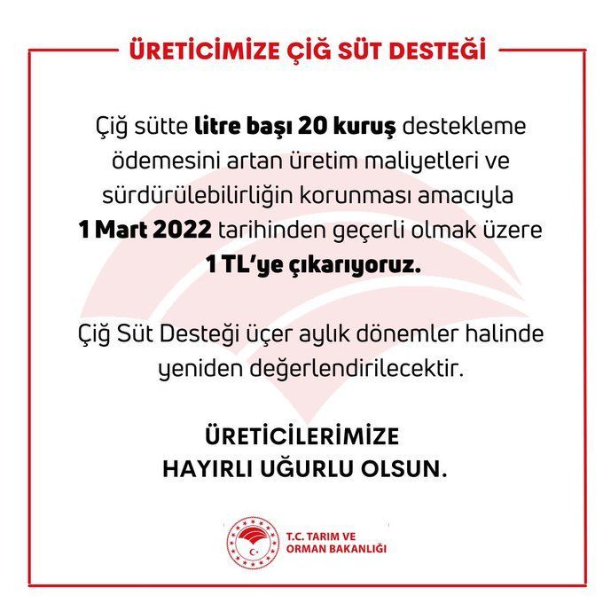 T.C Tarım ve Orman Bakanlığı tarafından Çiğ süte litre başı 20 Kuruş olan destekleme miktarı 1 Mart 2022 tarihinden geçerli olmak olmak üzere 1 TL ye çıkarılmıştır.
