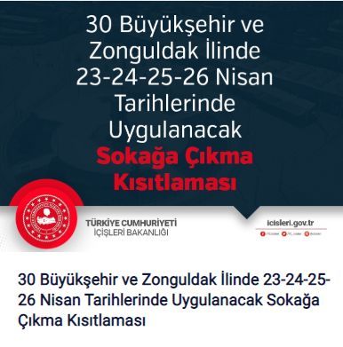 Bakanlığımız tarafından 81 İl Valiliğine yeni tip Kovid 19 salgını ile mücadele kapsamında “Sokağa Çıkma Kısıtlaması Genelgesi” gönderildi. Genelge ile büyükşehir statüsündeki 30 İl ile Zonguldak il sınırlarında 22 Nisan saat 24.00 ile 26 Nisan 24.00 saatleri arasında belirtilen istisnalar hariç olmak üzere vatandaşların sokağa çıkmaları kısıtlanacak.