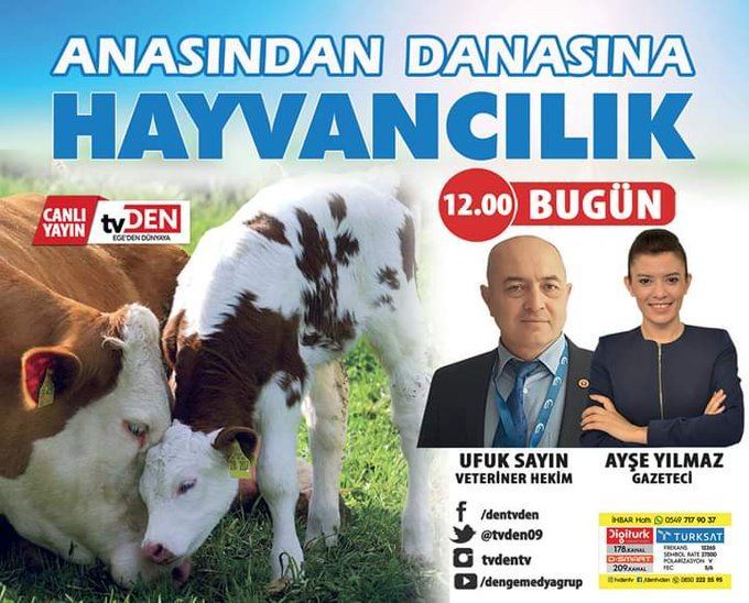Yön.Kur.Üyemiz Veteriner Hekim Ufuk SAYIN bugün saat 12.00'da TvDEN kanalında Gazeteci Ayşe Yılmaz'ın sunduğu Süt ineklerinin beslenmesi ,Süt veriminin arttırılmasının konuşulacağı " Anasından Danasına Hayvancılık "programının canlı yayın konuğu olacaktır.